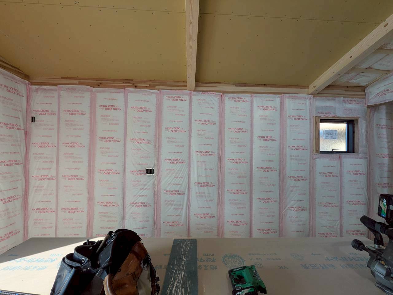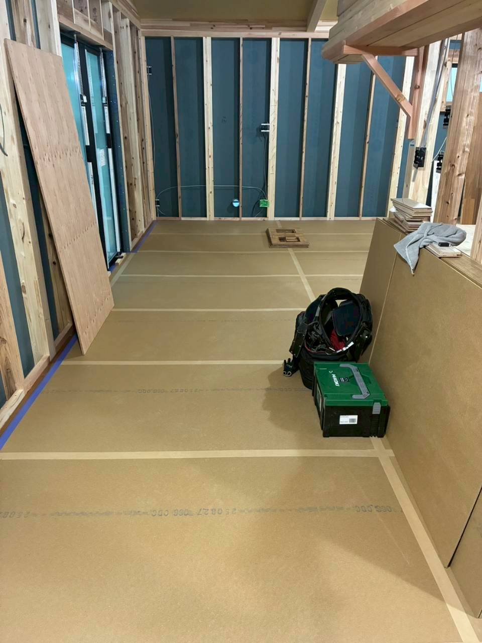 内部の方も断熱材の施工が完了して、床貼り作業をしている状況です。