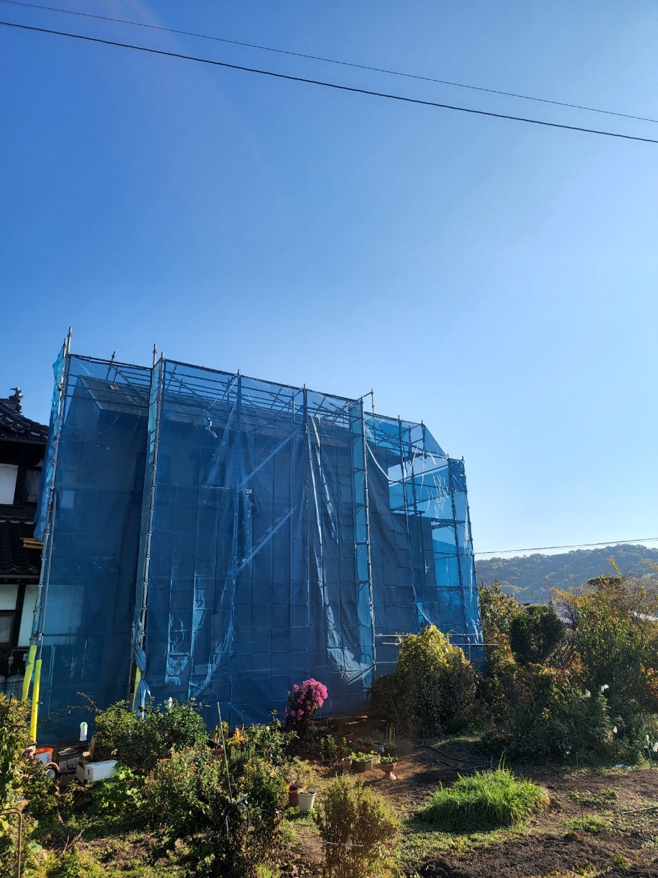 秋晴れの気持ちいい天気に恵まれて、今日から熊野町城之堀にて外壁と屋根工事が始まりました。