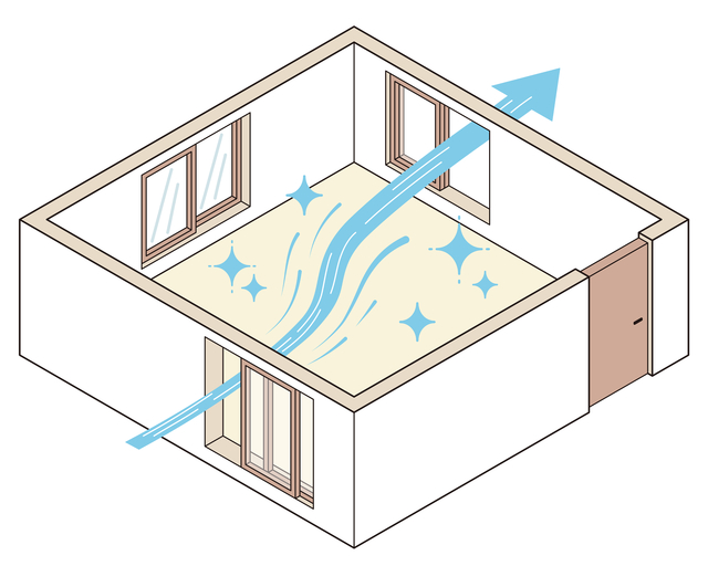 大きな家具がある、対になる場所に窓がない、一方向しか開けられない、間に壁がある…という部屋は、扇風機で中の空気を出したり循環させるだけでも効果はあります。
