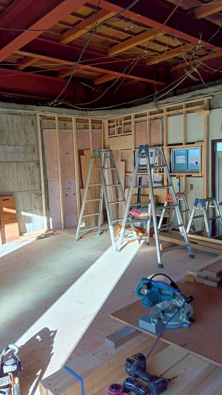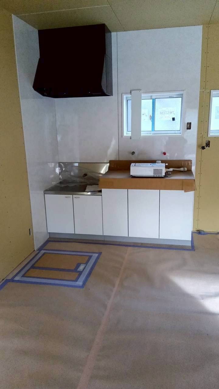 現在まだ工事途中ですが、キッチンまわりと床工事が進んでいます。